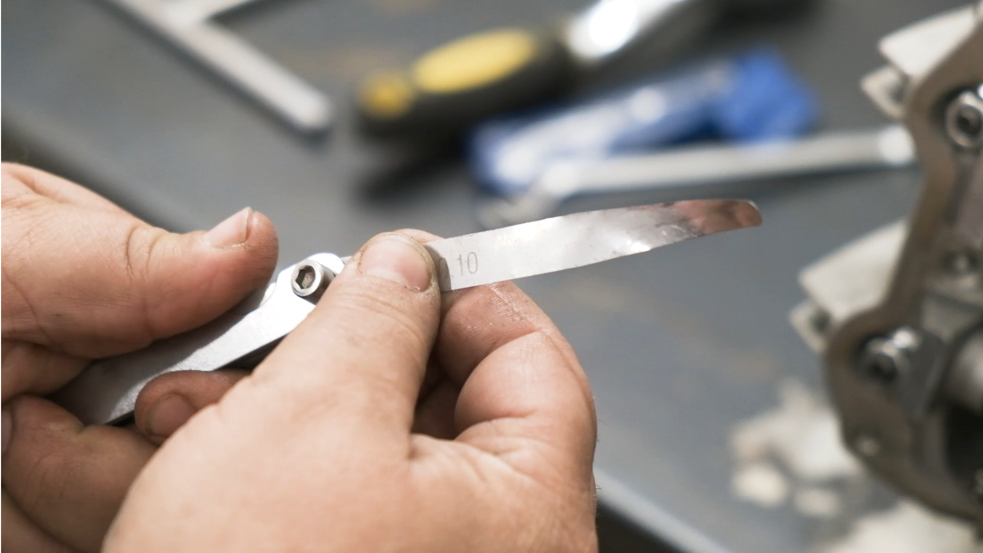 Cuando ya tengamos la contratuerca apretada, es recomendable volver a comprobar el reglaje. En el caso de que se haya ajustado a 0,10 mm, debemos comprobar que la galga de 0,10 mm entra bien, y la del siguiente tamaño no entra.