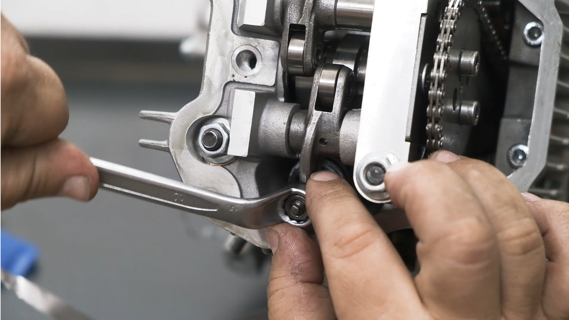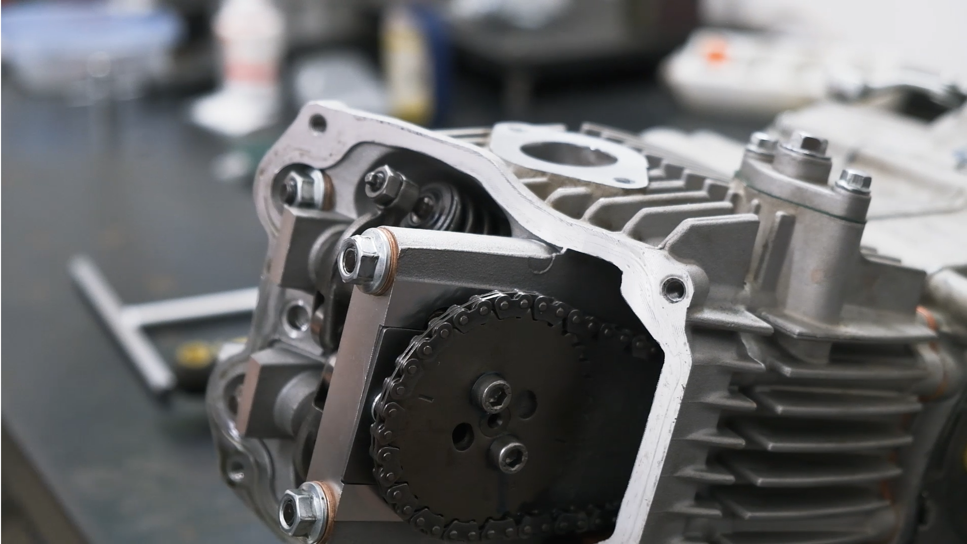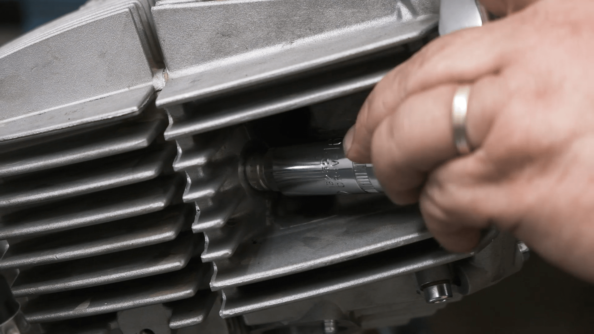 Una vez tenemos la bujía desmontada, retiramos la tapa exterior de la culata, donde se encuentra el piñón de la cadena de transmisión, con la ayuda de una llave de 10.