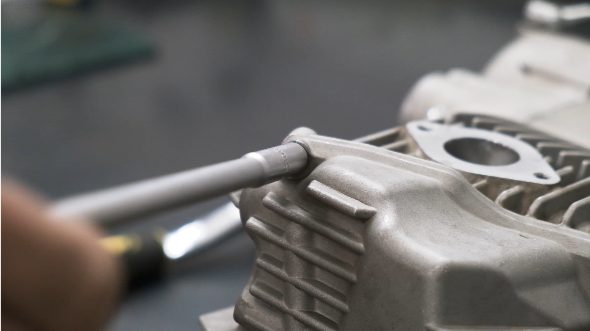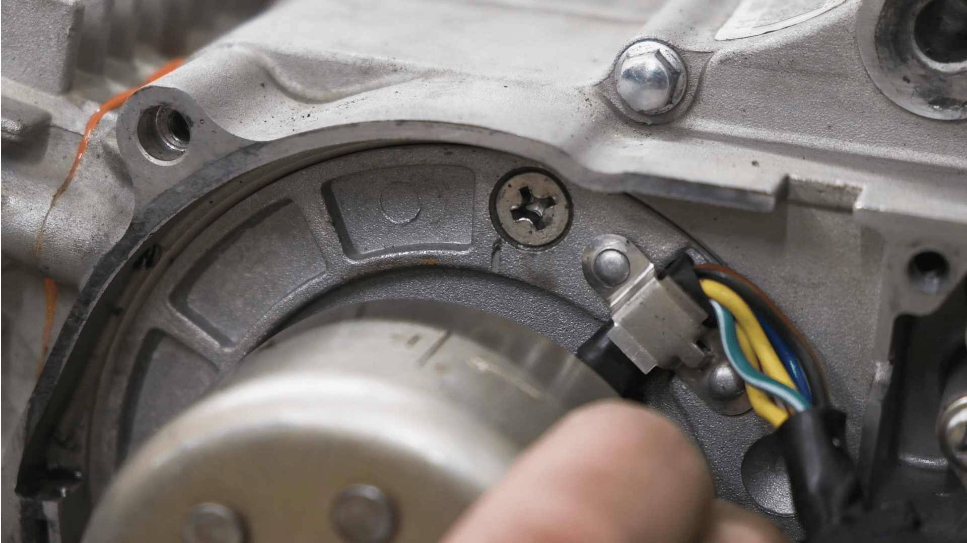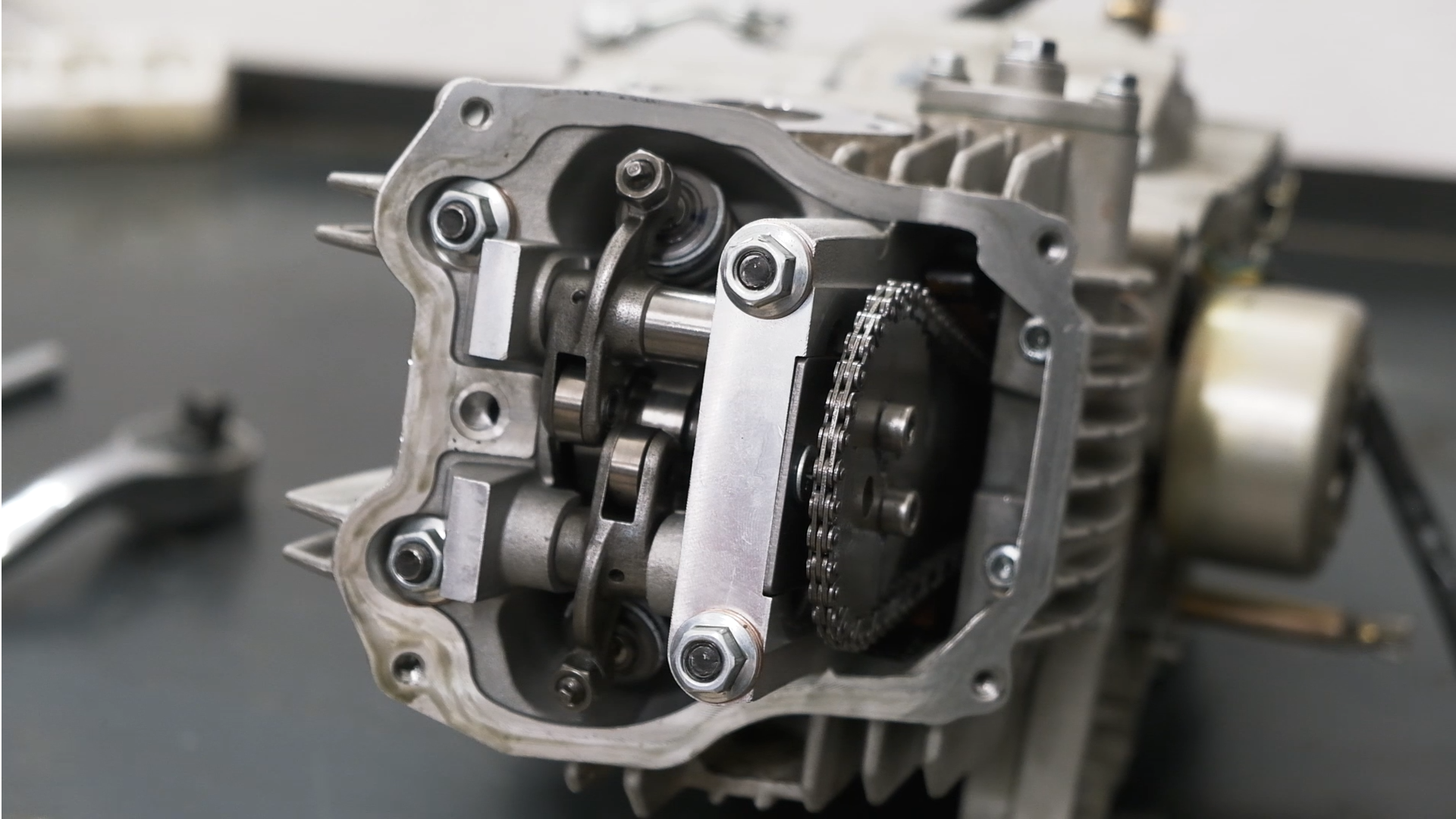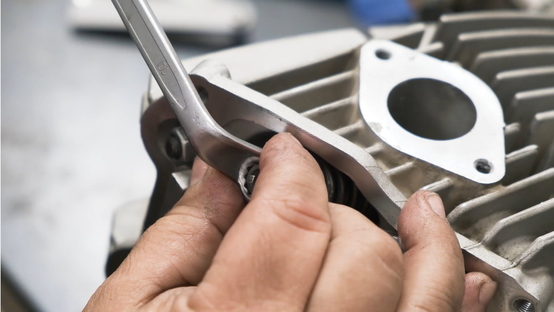 Una vez tenemos la bujía desmontada, retiramos la tapa exterior de la culata, donde se encuentra el piñón de la cadena de transmisión, con la ayuda de una llave de 10.