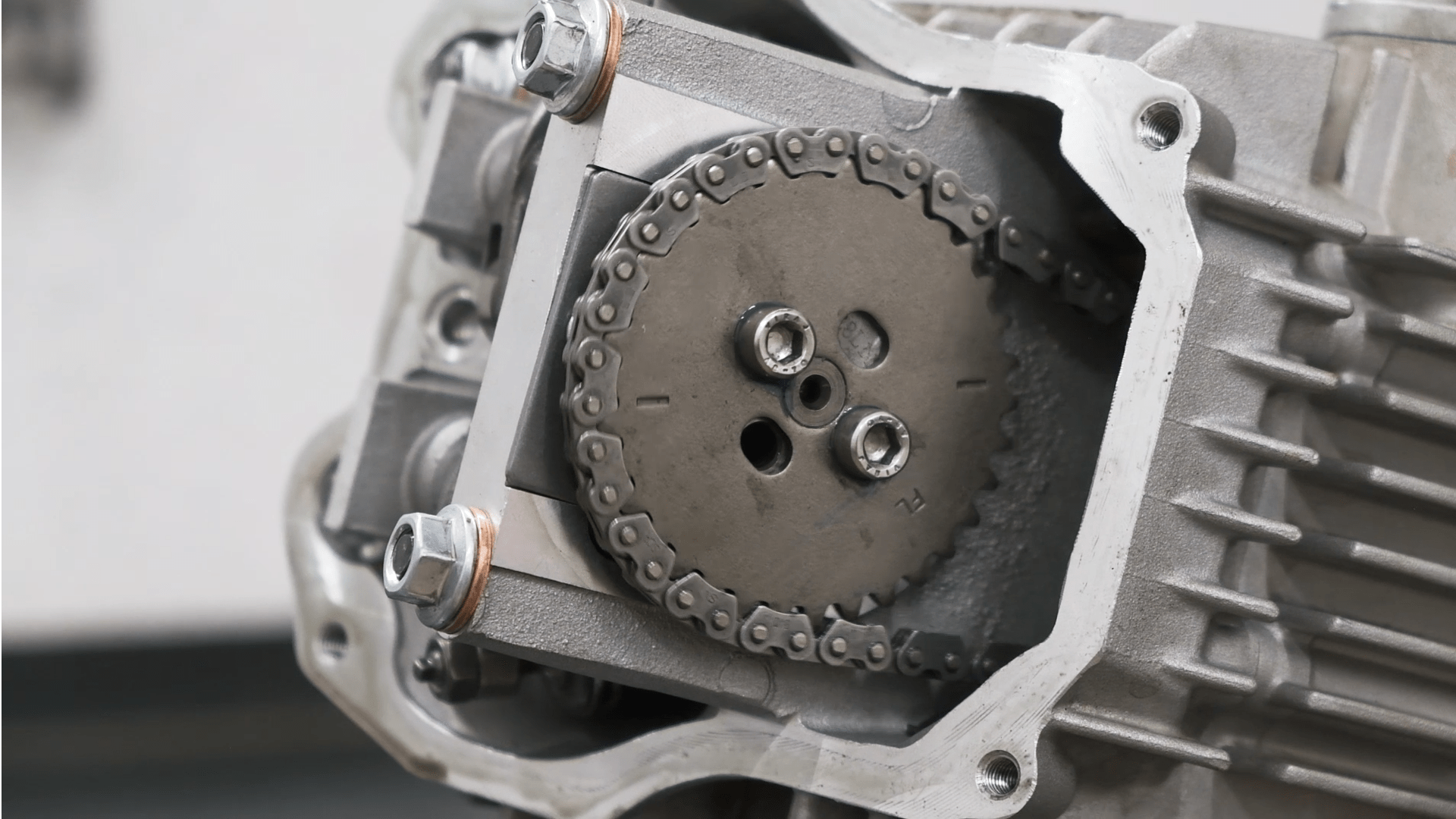 La inspección y el ajuste de la holgura de las válvulas deben realizarse con el pistón en el PMS. Por ello con la tapa de la culata retirada, y con la tapa del volante magnético también desmontada, buscaremos la marca “T” estampada en el volante magnético y la haremos coincidir con la marca indicadora entre el piñón de la cadena y la propia culata.