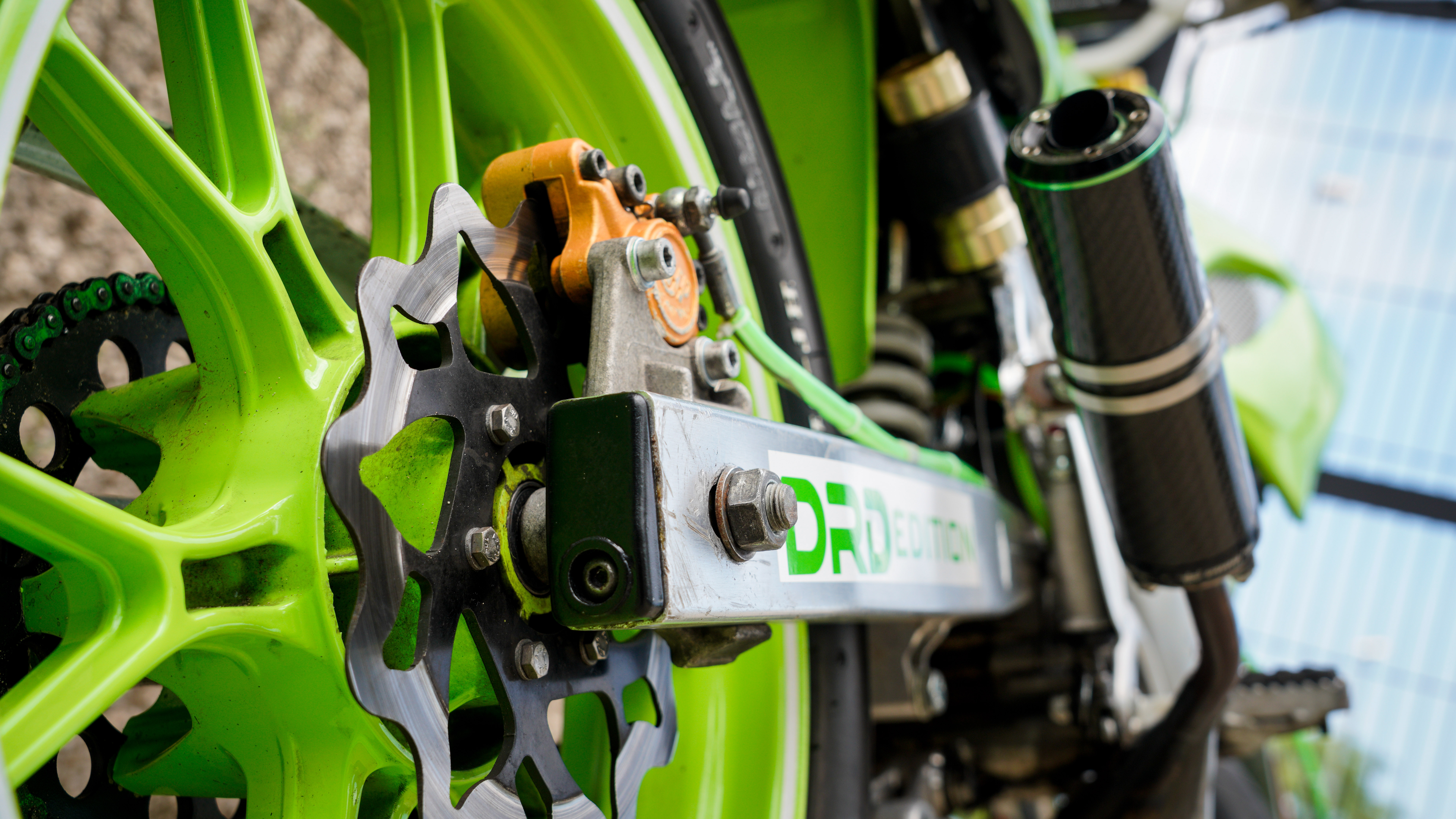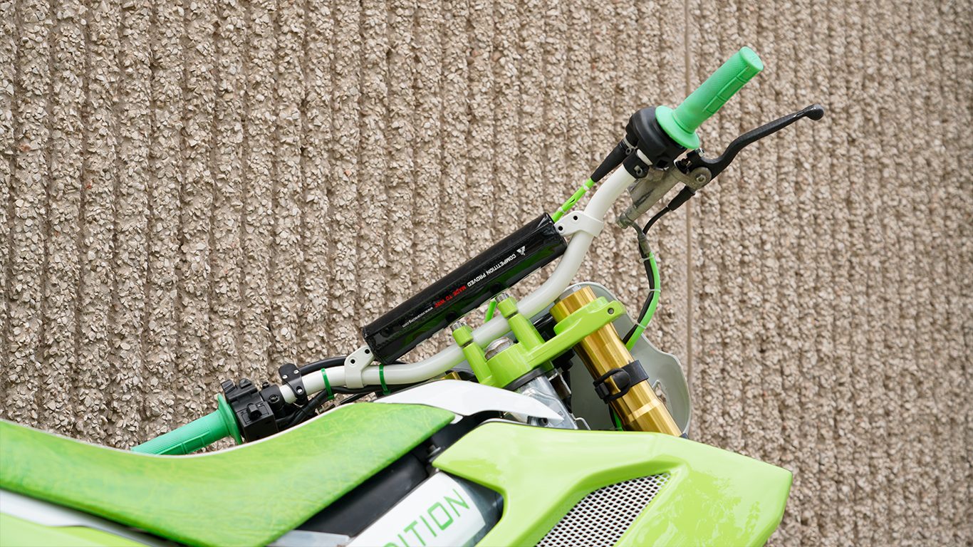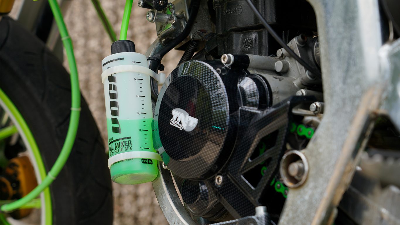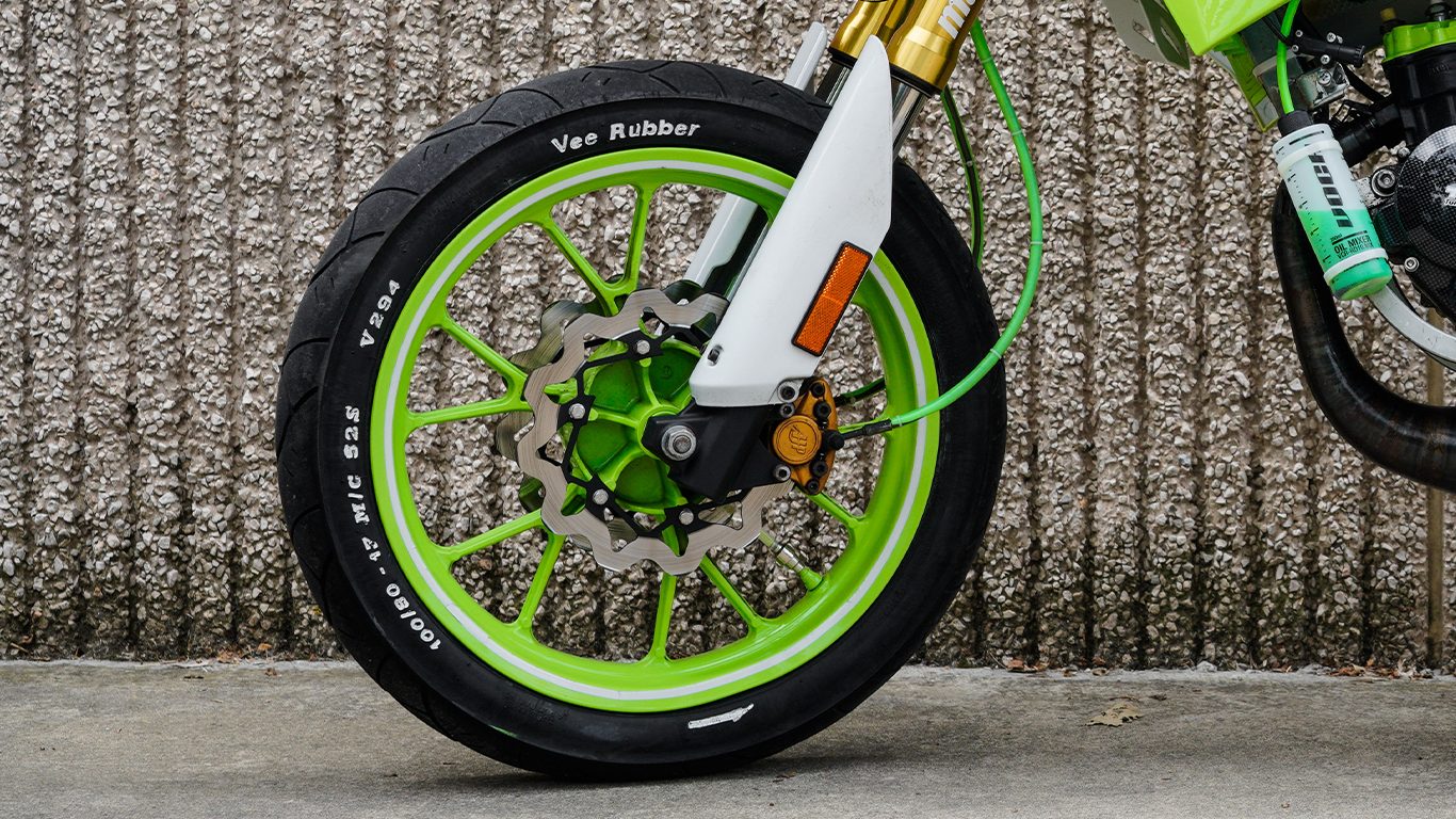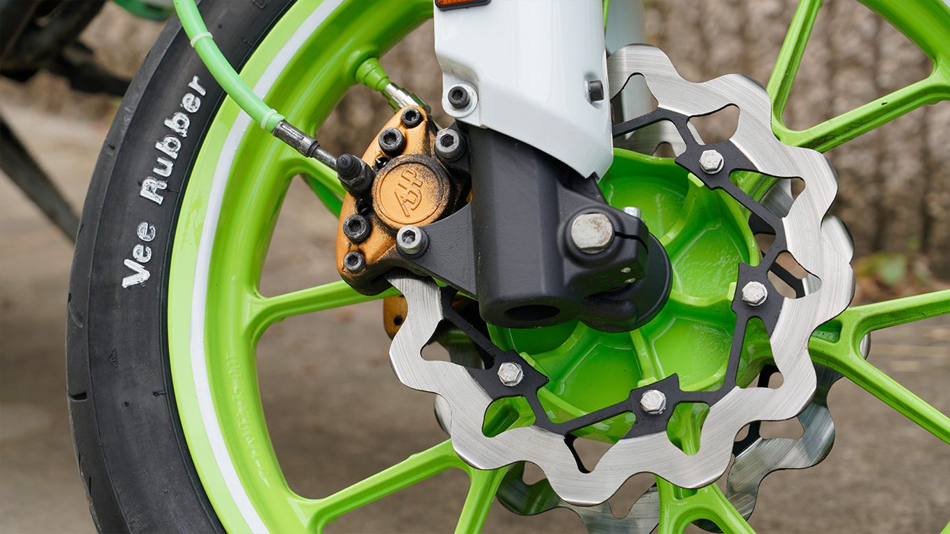 La estética ha sido cuidada, siguiendo una misma línea y color en varios acabados y en la funda de freno que ha sido hecha con el tubo de gasolina ALLPRO.