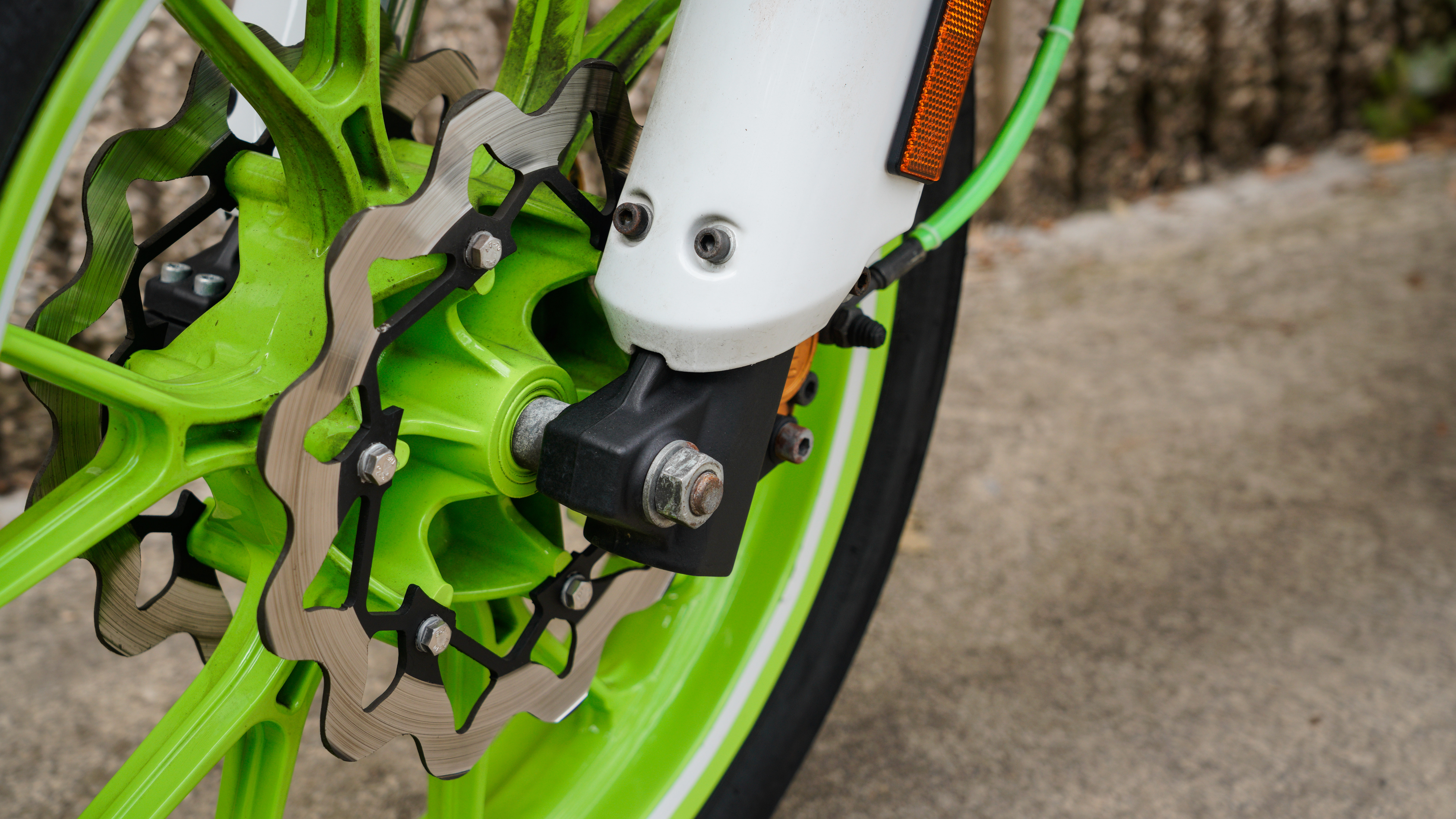 Es importante fijarse en el detalle de los frenos, concretamente en los dos discos delanteros y el disco trasero. El modelo de los discos es de Galfer Wave.