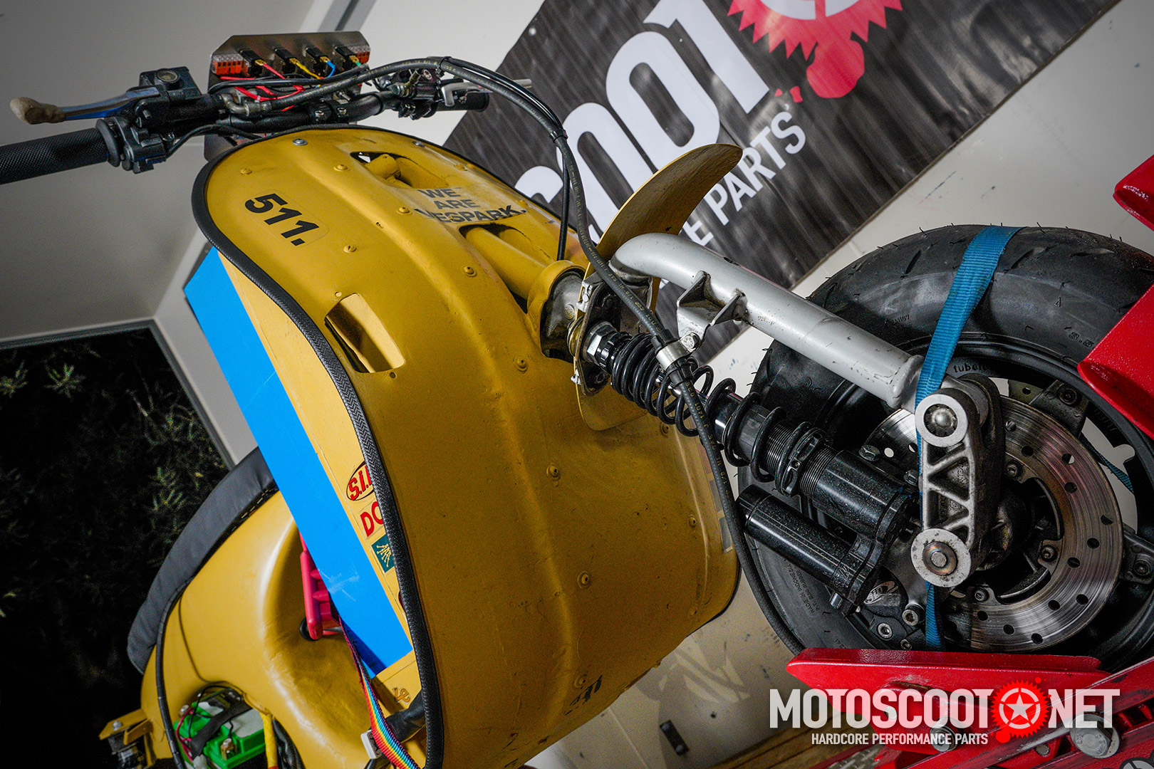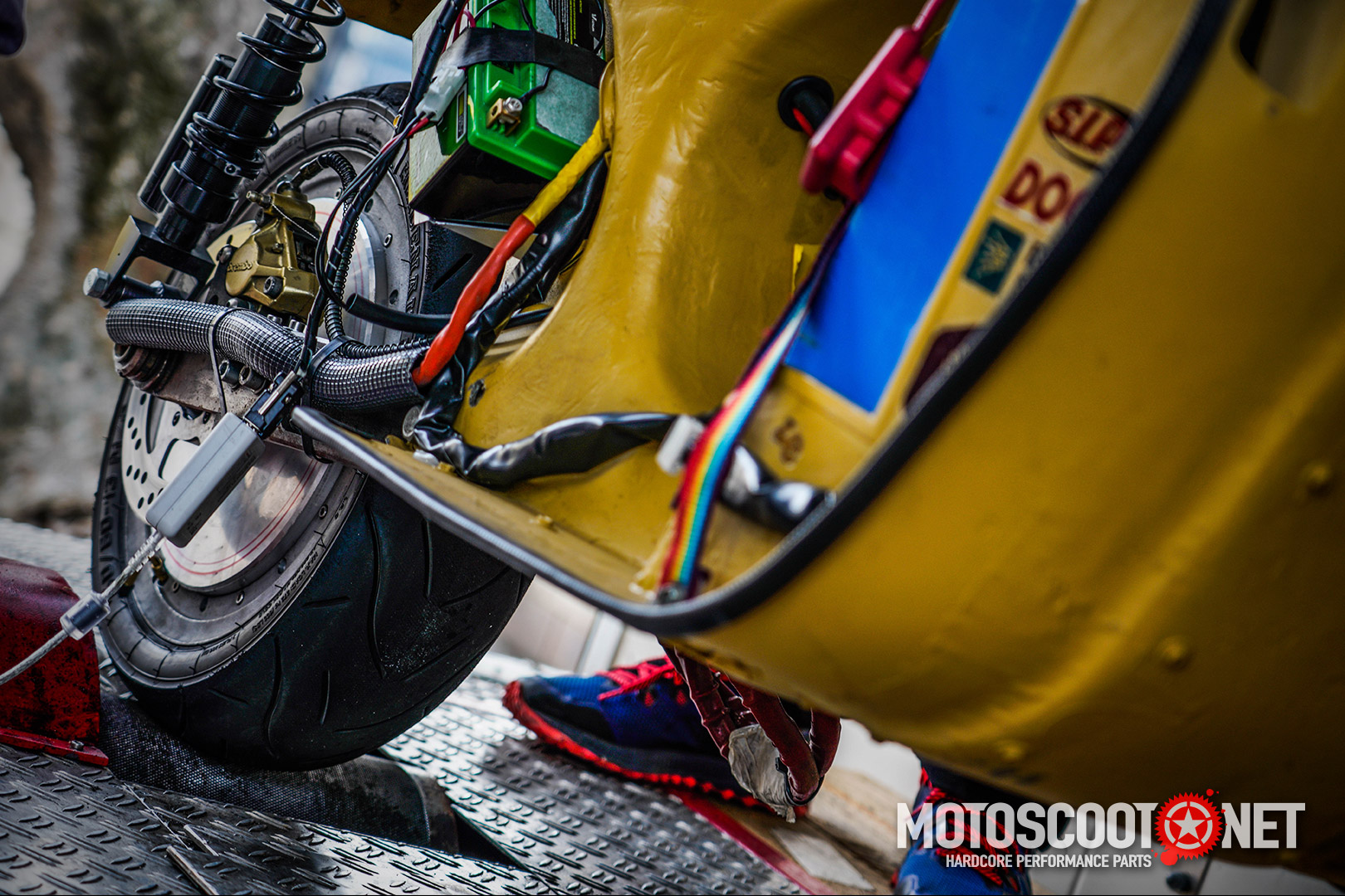 A parte ciclo é um chassi de Vespa PX 200 de competição, integegrado com um motor de corrente contínum sem escovas, alimentadado por baterias intercambiáveis de alta densidade energética de Lítio. O motor está alojado num braço oscilante CNC com duas suspensões.